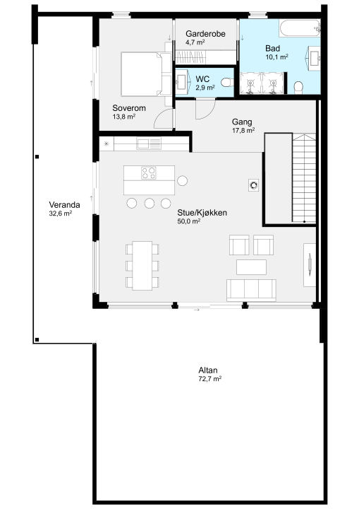 Andre etasje byr på hovedsoverom med walk-in garderobe og eget bad, samt en stor, åpen stue- og kjøkkenløsning på hele 50 m². Herfra har du direkte utgang til uteområdet, noe som gjør det enkelt å ta middagen eller kaffekoppen ut i frisk luft.